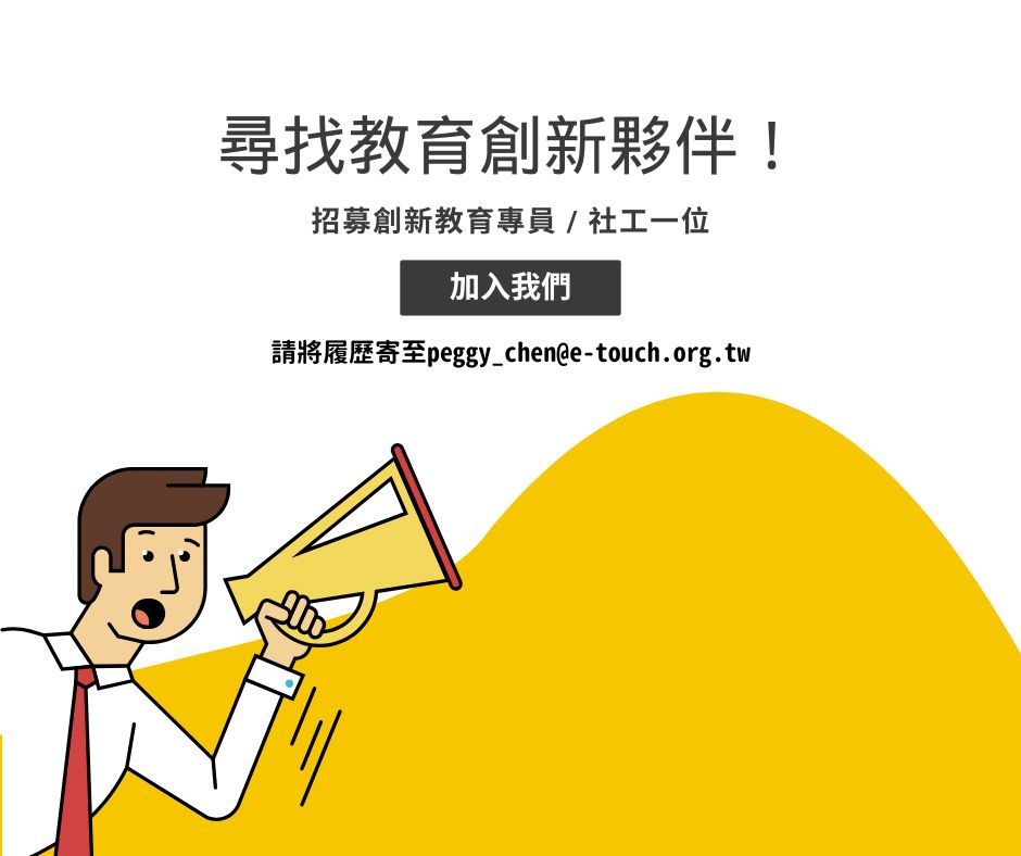 請將履歷寄至peggy_chen@e-touch.org.tw(主旨請註明:應徵創新教育專員/社工-姓名)