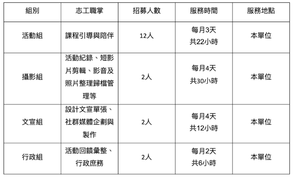 *服務時間:週五、週六,活動組與攝影組則依職人工作坊時間安排